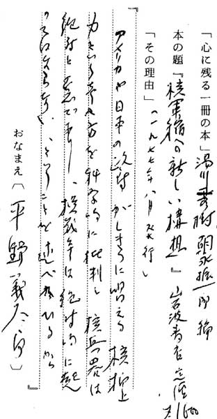 | テキスト:002 *平野義太郎(明30)日本平和委員会名誉会長 湯川l秀樹・朝永振一郎編「核軍縮への新しい構想」(岩波書店※) 『アメリカや日本の政府がしきりに唱える核抑止力という考え方を科学的に批判し、核兵器は絶対に悪であり、核戦争は絶対的に起ってはならない、ということを述べているから』 |