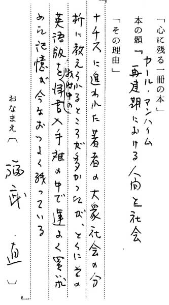 | テキスト:001 **福武 直(大6)東大教授 社会学 カール・マンハイム「再建期における人間と社会」( ) 『ナチスに追われた著者の大衆社会の分析に教えられるところが多かったが、とくにその英語版を戦時中の洋書入手難の中で運よく買い求めた記憶が今なおつよく残っている』 |