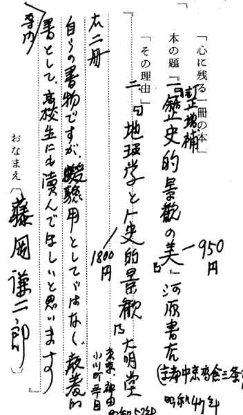 | テキスト:002 **藤岡謙二郎(大3)京大教授 歴史地理学 藤岡謙二郎「訂正増補歴史的景観の更」(河原書店※) 藤岡謙二郎「地理学と歴史的景観」(大明堂※) 『上二冊、自らの書物ですが、受験用としてではなく、教養的専門書として、高校生にも読んでほしいと思います』 |