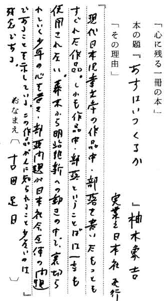 | テキスト:001 **古田足日(昭2)児童文学 柚木象吉「あすはいつくるか」(実業之日本社※) 『現代日本児童文学の作品中、部落を書いたもっともすぐれた作品。しかも作品中、部落ということば一言も使用されない。幕末から明治維新への動きの中で、裏切られていく少年の心を書き、部落問題が日本社会の問題であることを示している。この作品が人に知られること少ないのは残念である』 |