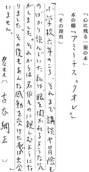 | テキスト:002 **古谷綱正(明亜)ニュースキャスター アミーチス「クオレ」(角川文庫) 『小学校6年のころ、それまで講談や冒険ものばかり読んでいた私は、眼を開かれるような気がしました。それからは名作ものに親しむようになりました。その後もあんな感動を受けた本には田会いません』 |
