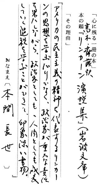 | テキスト:002 **本間長世(昭4)東大教授 アメリカ史 「リンカーン演説集」(岩波文庫※) 『アメリカの民主主義の精神を代表するリンカーンの思想を学ぶだけでなく、政治家が重大な責任を果たしながら、政治家としても、人間としても成長していく過程を学ぶことができて、印象深い書物』 |