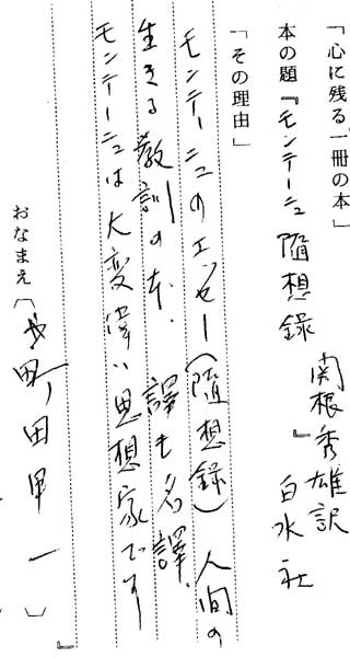 | テキスト:001 **町田甲一(大5)名大教授 美術史 モンテーニュ「随想録」(白水社※ 岩波文庫) 『モンテーニュのエッセ(随想録)、人間の生きる教訓の本、訳も名訳、モンテーニュは大変偉い思想家です』 |