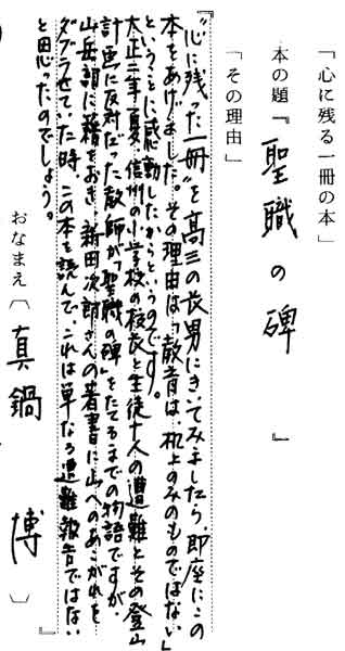 | テキスト:002 **真鍋 博(昭7)イラストレイター 新田次郎「聖職の碑」( ) 『「心に残った一冊」を高三の長男にきいてみましたら、即座にこの本をあげました。その理由は、「教育は、机上のみのものではない」ということに感動したからというのです。大正二年夏、信州の小学校の校長と生徒十人の遭難とその登山計画に反対だった教師が「聖職の碑」をたてるまでの物語ですが、山岳部に籍をおき、新田次郎さんの著書に山へのあこがれをダブラせていた時、この本を読んで、これは単なる遭難報告ではないと思ったのでしょう』 |