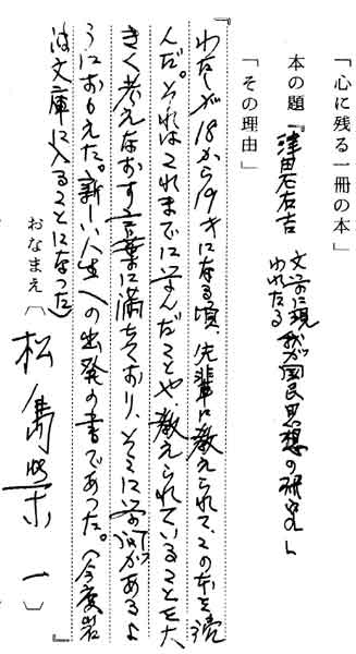 | テキスト:001 **松島栄一(大6)東大史料編纂所員 日本史 津田左右吉「文学に現われたる我が国民思想の研究」(岩板書店) 『わたしが18から19才になる頃、先輩に教えられて、この本を読んだ。それはこれまでに学んだことや、教えられていることを大きく考えなおす言葉に満ちており、そこに学問があるようにおもえた。新しい人生への出発の書であった。(今度岩波文庫に入ることになった)』 |