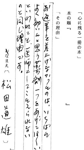| テキスト:002 **松田道雄(明41)評論家 『お返事を差上げなかったのは、いちばんよく効いたと思う薬剤一つをあげてほしいといわれても、医師としてこたえられないのと同じ理由です』 |