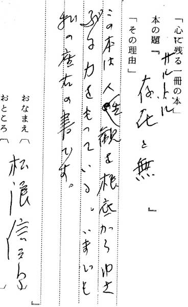 | テキスト:001 **松浪信三郎(大2)早大教授 哲学 サルトル「存在と無」( ) 『この本は人生観を根底からゆさぶる力をもっている。いまでも私の座右の書です』 |