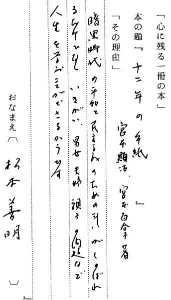 | テキスト:002 **松本善明(大15)国会議員 官本顕治・百合子「十二年の手紙」(新日本新社) 『暗黒時代の平和と民主主義のための闘いがしのばれるだけでなく、いきがい・男女・夫婦、親子の問題など人生を学ぶことができるからです』 |