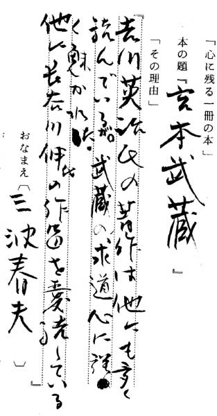 | テキスト:001 **三波春夫(大12)歌手 吉川英治「宮本武蔵」(中央公論) 『吉川英治氏の著作は他にも多く読んでいるが、武蔵の求道心に強く魅かれた。他に長谷川伸氏の作品を愛読している』 |