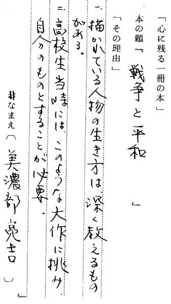 | テキスト:002 **美濃部亮吉(明37)東京都知事 トルストイ「戦争と平和」(岩波文庫) 『1.描かれている人物の生き方は、深く教えるものがある。 2.高校生当時には、このような大作に挑み、自分のものとすることが必要』 |
