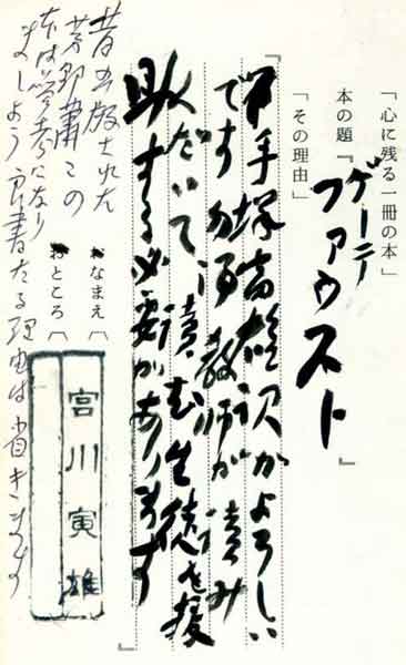 | テキスト:001 **宮川寅雄(明41)和光大教授 思想史 ゲーテ「ファウスト」(岩波文庫) 『手塚富雄訳がよろしいです。勿論教師が読みくだいて、読む生徒を援助する必要があります』 |