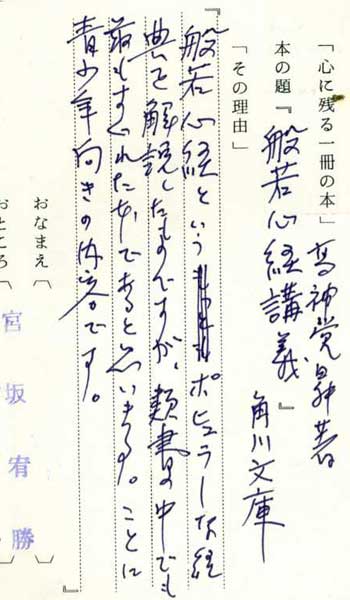 | テキスト:002 **宮坂宥勝(大10)名大教授 インド学 高神覚昇「般若心経講義」(角川文庫※) 『破若心経というポピュラーな経典を解説したものですが、類書の中でも最もすぐれた本であると思います。ことに青少年向きの内容です』 |