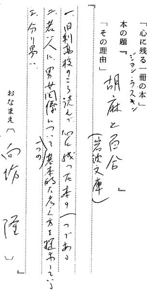 | テキスト:001 **向坊 隆(大6)東大学長 原子炉材料学 ジョン・ラスキン「胡麻と百合」(岩波文庫※) 『1.旧制高校のころ読んで、心に残った本の一つである。2.若い人に、男女関係について一つの基本的な考え方を提示してそる。 3.分り易い』 |