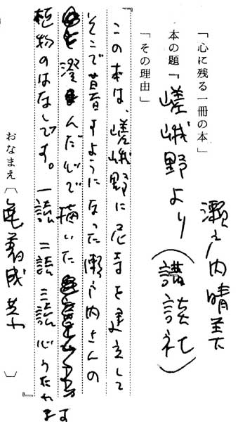 | テキスト:002 **無着成恭(昭2)明星学園教諭 日本語教育 瀬戸内晴美「嵯峨野より」(講談社※) 『この本は、嵯峨野に尼寺を建立して、そこで暮すようになった瀬戸内さんの澄んだ心で描いた植物のはなしです。一読二読三読、心をうたれます』 |