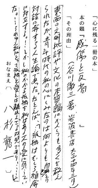 | テキスト:001 **八杉竜一(明44)早大教授 科学史 谷川徹三「感傷と反省」(岩波書店※) 『東西の文明批評や文化の本質論にかんしても多くを教えられたが、青年時代の私の心にしみたのは何よりも自己との対話に発する人生論であった。たとえば、「・…‥孤独はむしろ頽廃に対立する。……しかし私のかかる孤独を私はある一人の愛に負うていた。……それゆえ私にとって孤独と愛とは離れざる双児であり、……』 |