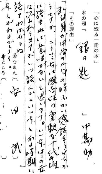 | テキスト:002 **安田 武(大11)評論家 中勘助「銀の匙」(岩波文庫) 『私自身が中学の2年の時ふかい感銘をうけたからですが、こういう本は感受性の柔軟な十代の頃に読まねば意味がないと思います。いい本はこの世に沢山ありますがいつ読んでもいい本とある時期に読まねばならぬ本とがあるでしょう』 |