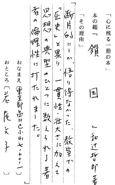 | テキスト:002 **若尾文子(昭8)俳優 和辻哲郎「鎖国」(筑摩書房) 『断片的にしか、悟り得なかった、教室での『歴史』と異り、一貫性、壮大さに加えて思想の典型のひとつに数えられる著者の倫理性に打たれました』 |