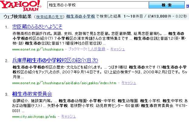 (4)ホームページをアップする注意点を見本ページで表示して欲しいという要望とAIK(相生インターネット研究会)の会員の強力で発行しています。期待が大きかったのか、半年で、検索エンジンのトップクラスになりました。 |