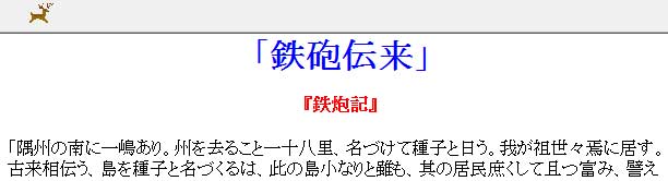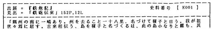 | 「隅州の南に一嶋あり。州を去ること一十八里、名づけて種子と日う。我が祖世々焉に居す。古来相伝う、島を種子と名づくるは、此の島小なりと雖も、其の居民庶くして且つ富み、譬えば播種に一種子を下して生々に窮り無きが如し、この故に名づくと。是より先、天文癸卯秋八月二十五丁酉、我が西村の小浦に一大船有り。何れの国より来るかを知らず、船客百余人、其の形類せず、其の語通ぜず、見る者以て奇怪となす。其の中に大明の儒生一人あり、五峰と名づくる者なり、今その姓字を詳にせず。時に西村の主宰に織部丞なる者あり、頗る文字を解す。偶五峰にあい、杖を以て沙上に書して云く、『船中の客、何れの国の人なるやを知らず、何ぞ其の形の異なるや』と。五峯即ち書して云く、『此れはこれ西南蛮種の賈胡あり、粗君臣の義を知ると雖も、未だそお礼貌の其の中に在るを知らず、これ故に其の飲するや杯飲して杯せず、其の食するや手食して箸せず、徒に嗜欲の其の情に□うを知り、文字の其の理に通うを知らざる也、所謂賈胡は一処に到りて轍つ止むとは、これ其の種なり、其の有る所を以て其の無き所に易えんのみ、怪しむべき者には非ず』 と。(中略)賈胡の長二人有り、一を牟良叔舎と日い、一を喜利志多佗太と日う。手に一物を携う。長さ二、三尺。其の体たるや、中通り外は直く、しかも重きを以て質となす。其の中常に通ると雖も、其の底密塞を要す。其の傍に一穴有り、火を通すの路なり。形象物の比倫すべきなきなり。 其の用たるや、妙薬を其の中に入れ、添ふるに小団鉛を以てす。先ず一小白を岸畔に置き、親ら一物を手にして其の身を修め、其の目を眇にして、其の一穴より火を放てば、則ち立ち所に中らざるはなし。其発するや掣電光の如く、其鳴るや驚雷の轟の如く、聞く者其耳を掩わざるはなし。(中略)時尭其の価の高くして及び難きを言はずして、蛮種の二鉄炮を求め、以て家珍となす。…」 | ||||||||||||||||||||||||