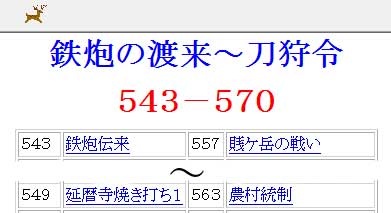 | <TR> <TD>543</TD> <TD align="left"><A href="0543.htm">鉄炮伝来</A></TD> <TD>557</TD> <TD align="left"><A href="0557.htm">賎ケ岳の戦い</A></TD></TR> 〜 <TR> <TD>549</TD> <TD align="left"><A href="0549.htm">延暦寺焼き打ち1</A></TD> <TD>563</TD> <TD align="left"><A href="0563.htm">農村統制</A></TD></TR> | ||||||||||||||||||||||||