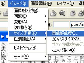 | A「イメージ」→「サイズ変更」→「画像解像度」 |