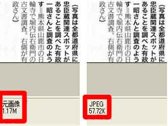 | スキャナで取り込んだ新聞があります。クリックして確認してください。 重さは76万バイトです。基準の約12倍の重さです。 これを、読めて、基準の6万バイトに軽くする方法をご紹介します。 |