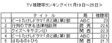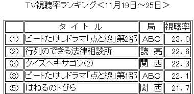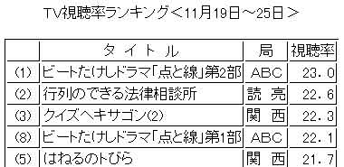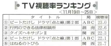 | <TR> <TD align="center">(1)</TD> <TD align="left">ビートたけしドラマ「点と線」第2部</TD> <TD align="center">ABC</TD> <TD align="right">23.0</TD></TR> <TR> <TD align="center">(2)</TD> <TD align="left">行列のできる法律相談所</TD> <TD align="center">読 亮</TD> <TD align="right">22.6</TD></TR> |