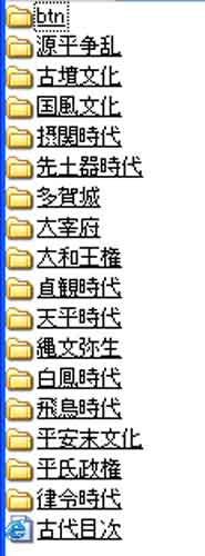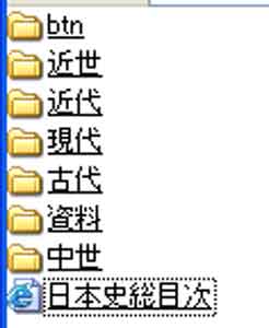 | 写真(2)は日本史¥古代のフォルダ名です。 (1)ここでは、日本語で入力しています。 (2)名前順ですから、歴史順にはなっていません。 | ||