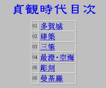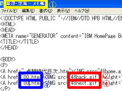 | 写真(2)は日本史¥古代¥貞観時代フォルダから最澄・空海のソース画面です。 (1)@「最澄・空海─メモ帳」は、最澄・空海のページをソース画面で見ていることを示しています。 (2)最澄・空海のページのA「back」は三筆なので、Bの00に三筆と入力します(三筆.htm)。 (3)最澄・空海のページのC「next」は彫刻なので、Cの00に彫刻と入力します(彫刻.htm)。 (4)これで相互リンクは完成です。 |