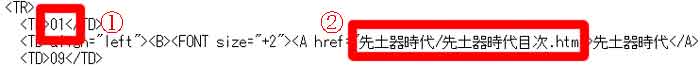 | 写真(5)はインターネット上の古代目次ページのソース画面です。 (1)@「01」のリンク先が日本語の「先土器時代」フォルダ」の「先土器時代目次」になっています。 (2)表示されない原因は、リンク先のファイル名が日本語だったからです。 |