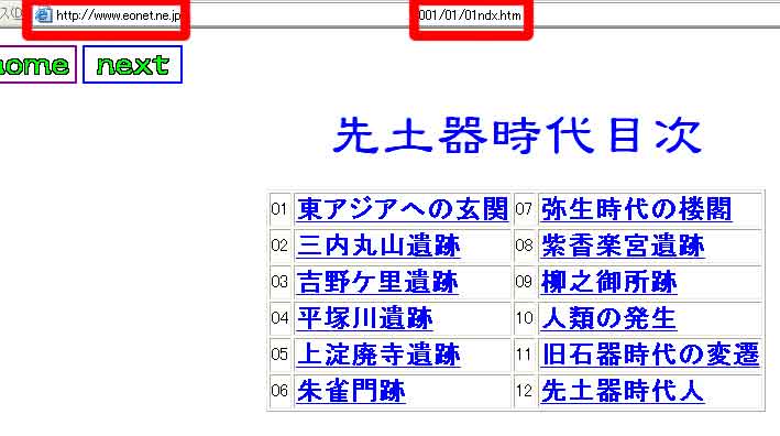 | 写真(2)は自分のパソコンのブラウザ(Webネット)画面です。 (1)リンク先のページです。 (2)リンク先の先土器時代目次が表示されました。 |