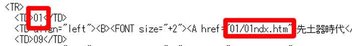 | 写真(5)はインターネット上の01ndx(古代目次)ページのソース画面です。 (1)@「01」のリンク先が半角英数の「01」フォルダの「01ndx.htm」になっています。 (2)表示された原因は、リンク先のファイル名が半角英数だったからです。 |