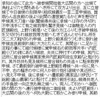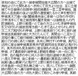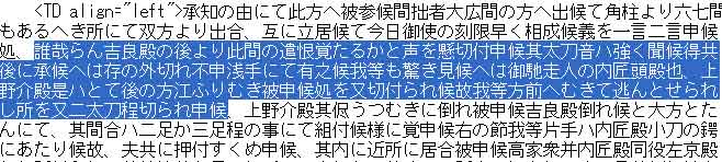 | 誰哉らん吉良殿の後より此間の遣恨覚たるかと声を懸切付申候其太刀音ハ強く聞候得共後に承候へは存の外切れ不申浅手にて有之候我等も驚き見候へは御馳走人の内匠頭殿也、上野介殿是ハとて後の方江ふりむき被申候処を又切付られ候故我等方前へむきて逃んとせられし所を又二太刀程切られ申候 |