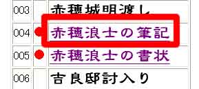 | 写真(3)は、忠臣蔵第三巻の目次です。 (1)「赤穂浪士の筆記」をクリックします(2回目)。 |