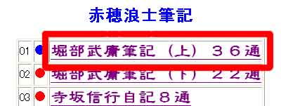 | 写真(4)は、赤穂浪士筆記の目次です。 (1)「堀部武庸筆記(上)36通」をクリックします(3回目)。 |