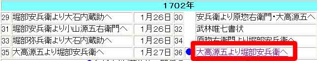 | 写真(5)は、「堀部武庸筆記(上)36通」の目次です。 (1)「大高源五より堀部安兵衛へ」をクリックします(4回目)。 |