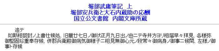 | 写真(6)は、「大高源五より堀部安兵衛へ」の書状です。 (1)膨大な史料から4回クリックするだけで必要な史料が検索できました。 (2)しかもテキスト文字ですから、必要なテキスト部分をドラッグ・コピー・貼り付けて、何度でも利用できます (3)これが情報処理の魅力であり、威力なのです。 |