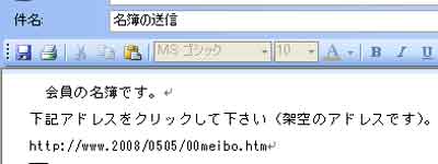 | 写真(1)は、受信メールの画面です。 (1)上のような受信メールが届きました。 (2)ホームページアドレス(http://www.2008/0505/00meibo.htm)をクリックします。←これは架空 |