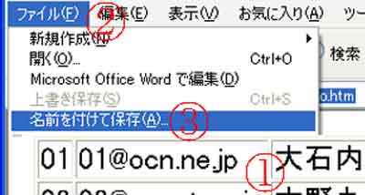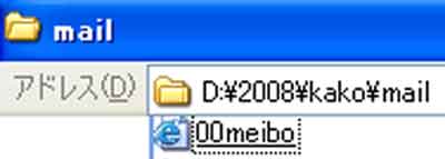 | 写真(4)は、「保存する場所」の「mail」に保存されたデータです。 (1)「マイコンピュータ」をクリック→保存場所を開きます(例:例:D\2008\kako\mail)。 (2)保存されたデータ(例:00meibo)をクリック(またはWクリック)します。 |