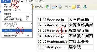 | 参考資料(1)は、写真(5)のソース画面です。 (1)「@01」は番号、「A01@ocn.ne.jp」はメールアドレス、「B大石内蔵助」は名前です。 |