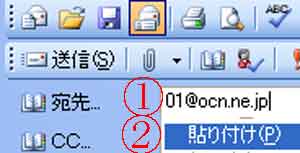 | 写真(7)は、メールの「新規作成」画面にメールアドレスを貼り付けしています。 (1)メールの「新規作成」をクリックします。 (2)「宛先」のメールアドレスを貼り付ける@場所を右クリック→「A貼り付け」をクリックします。 (3)件名、本文を入力して、「送信」をクリックします。 |