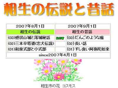 | 写真(1)は、「相生市の伝説と昔話」のホームページです。 (1)2007年4月1日に「相生市の伝説と昔話」をアップしました。 (2)相生市の担当者と、質量とも日本1を目指すことを密かに決意しました。 (3)「質量とも日本1を目指す」というLofty Ideal(高邁な理論=哲学)があり、それによりTactics(戦略・戦術)を練り、具体的なTask(作業)をすることが出来ました。 |
