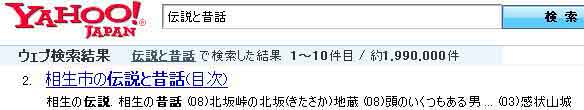 | 写真(2)は、ヤフーの検索です。 (1)2008年7月、ヤフーで「伝説と昔話」を入力しました。 (2)約199万件の内2番目にランクされました。 |