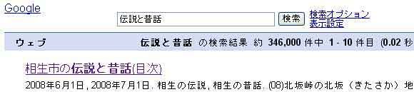 | 写真(3)は、Googleの検索です。 (1)2008年7月、グーグルで「伝説と昔話」を入力しました。 (2)約34万件の内1番目にランクされました。 |