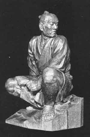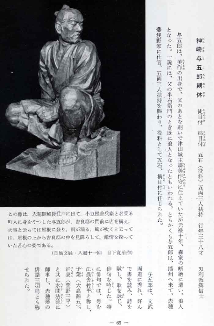 | かんざき よごろう のりやす 神 崎 与五郎 則休 徒目付 郡目付五石(役料)五両三人扶持 行年三十八才 匁利教劔信士 みまさか もりみまさかのかみ 与五郎は、美作の出身で、父のあとを嗣いで津山城主森美作守に仕えていたが元禄十年、森家の断絶に遭い、浪人となった。一説には、父の半右衛門のとき既に浪人となったともいわれる。ともかくも与五郎は、播州へ来て、赤穂藩浅野家に仕官、五両三人扶持を賜わり、役料として五石、横目付に任じられた。 五郎は、文武両道に秀れ、好んで書を読み、詩を賦し、歌を詠じ、俳句を吟じた。特に俳句では、号を 江農舎竹平と称し、子葉(大高源五)、涓泉(萱野三平)と共に水間沾徳に師事し、赤穂藩の俳諧三羽烏とも称せられた。 この像は、赤穂開城後江戸に出て、小豆屋善兵衛と名乗る町人に身をやつした与五郎が、吉良邸の門前に店を構え、火事と云っては屋根に登り、雨が漏る、風が吹くと云っては、屋根の上から吉良邸の中を見降ろして、敵情を探っていた苦心の姿である。 (日展文展・入選十一回 目下寛治作) 65 | ||||||||||