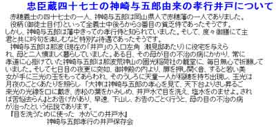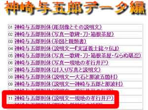 | 写真(2)は、「神崎与五郎データ編」の目次です。 (1)(11)「神崎与五郎則休(説明文━現地の孝行井戸)」をクリックします。 |