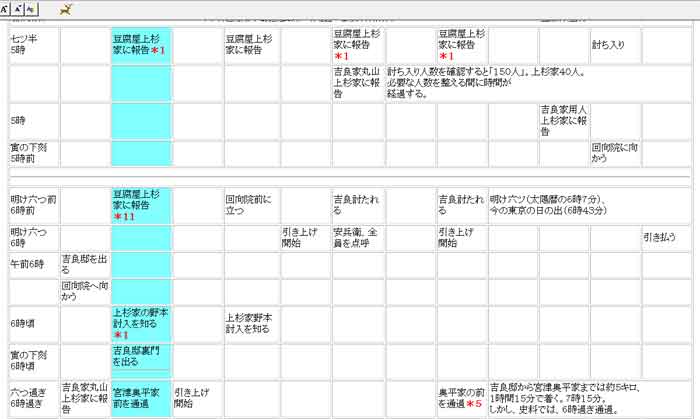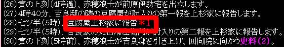 | (27)4時40分、吉良邸の隣の豆腐屋が討入りの第一報を上杉家に報告します。 (28)七ツ半(5時)、吉良邸の隣の豆腐屋が討入りの第一報を上杉家に報告します史料(1)。 (29)七ツ半(5時)、吉良家の丸山清左衛門が討入りの第二報を上杉家に報告します。 (30)寅の下刻(5時前)、赤穂浪士が吉良邸を引き上げ、回向院に向かう史料(2)。 | ||||||
