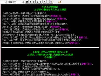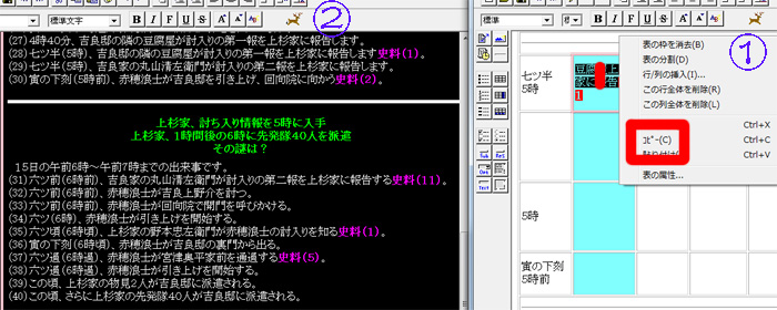 | 写真(1)は、忠臣蔵時刻表(討入り・引き上げなど)です。 (1)ビルダー3の作った膨大なデータ集です。 | ||||||