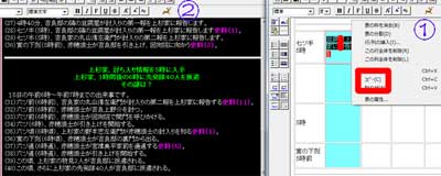 | 写真(3)は、ビルダー3の2つの窓を使い編集している所です。 (1)@は、コピー元(ビルダー3で編集した忠臣蔵時刻表)です。 (2)Aは、コピー先(ビルダー3で編集している忠臣蔵新聞)です。 (3)@のコピー元(ビルダー3で編集した忠臣蔵時刻表)から必要なデータをドラッグし、反転した文字を右クリックし、「コピー」をクリックします。 (4)Aのコピー先(ビルダー3で編集している忠臣蔵新聞)に貼り付けます。 | ||||||
