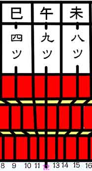 | 14日の午前0時〜午前1時までの出来事です。 (3)九ツ(0時)、大石内蔵助らが堀部弥兵衛宅を出立しています。 (4)子の刻(0時)、大石内蔵助らが堀部安兵衛宅へ集合します。 (5)この頃、吉田忠左衛門らが亀田屋へ集合します。 (6)九ツ半(1時)、大石内蔵助らが堀部安兵衛宅へ集合します。(4)と内容は同じですが、1時間の差が生じています。 (7)丑の上刻(1時)、赤穂浪士が各々三か所に集合します。 |